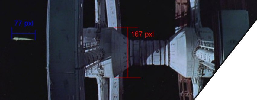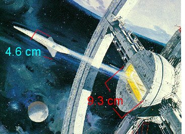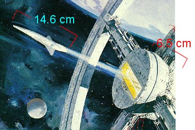 The final scale comparison is again between the space station and the spaceplane... but not from the film, but from promotional art. A painting by Robert McCall shows an Orion 3 jetting away from the station, and close enough to get good scale comparisons. Two means are available: measureing wingspan vs. hub diameter, and length vs. hub length. For this, a full-scale postwer was used, and dimensions are in directly measured centimeters. (the poster shows more area than the small scan below)