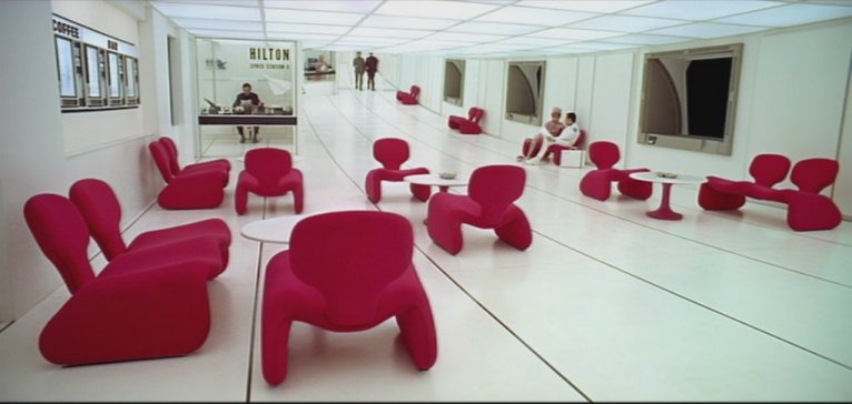The only direct scale comparisons are with the orion 3, and one scene looking out of the launch bay. In the "floor," "walls" and "ceiling" of the bay are insets with some EXTREMELY large windows, behind which can be seen people working, sitting, walking around, etc. A direct comparison between apparent height in pixels of one of the figures and the height of the bay can be made. This is complicated by the fact that the windows are recessed somewhat, and this must be accounted for. Also, the view angle on the figures in not dead-on, so some educated guesswork is needed. A height from between 44 and 49 feet seems to fit for the launch bay. When scaling the rest of the station from the height of the bay, diameters from 1196 to 1332 feet are produced. While in the ballpark of what Ordway suggested, these are nonetheless notable larger.