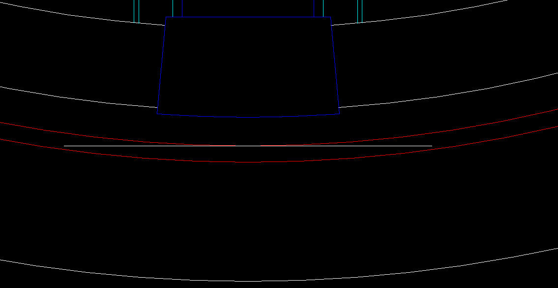 A last effort was made to sanity check the 1200 foot diameter. Shown in Figure 7 is a blowup of the CAD model, showing the floor and ceiling of the upper level of the rim, with a 6.75 foot ceiling height (in red). The horizontal white line is a 150 foot length (Ordway has written that the full scale set was 150 feet long).